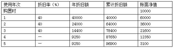 某公司的生产机器采用双倍余额递减法计算折旧,该机器原价100000元,可使用5年,预计净残值为3100元。折旧计算过程如下: