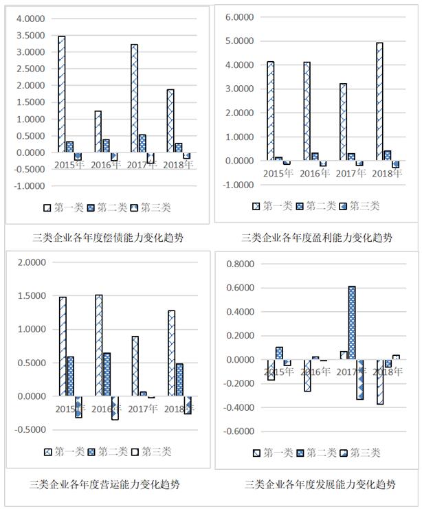 在提取公因子过程中可以得到总方差解释表,根据其中的累计方差24.701%、46.944%、67.746%和83.078%,求出每个公因子所占的权重,根据权重和每个公因子的得分,计算出重污染行业上市公司财务绩效综合得分。综合得分大于0的公司,说明其财务绩效位于总体平均水平以上。 实证结果得知,这461家上市公司在2015年~2018年四年间的财务绩效综合得分大于0的公司数量分别有202、199、192、207,占所研究上市公司的比率分别为43.82%、43.17%、41.65%、44.9%。这四年来财务绩效大于0的公司数量较少,比重较低,说明重污染企业整体财务绩效水平较差。2016年重污染上市公司财务绩效综合得分相对较低,通过对宏观经营环境分析,2016年国内外经济形势持续低迷,行业市场环境较差,到2017年经济有所复苏。博闻科技、有研新材、金田铜业、四川金顶、众源新材、贵研铂业等公司相对来说各年财务绩效变化幅度较小,经营状况稳定,财务绩效较高,具有一定的投资前景。通过分析这些公司各年度年报信息可知,面对大环境的挑战,博闻科技、有研新材、金田铜业、四川金顶、众源新材、贵研铂业等公司在2016年均积极进行产业结构调整,加快去产能步伐,加强环保执法等措施来改善公司经营状况。2017年国内外经济形势有所复苏后,继续推进供给侧改革,开展提质增效活动严控企业开支,推行以市场需求为导向、以成本控制为重心的经营策略,减少存货积压,降低生产成本和资金的占用,加大新产品新技术研发的投入力度,使得公司有向好发展的势头。而海利生物、方盛制药、广州发展等公司面对大环境的变化反应过慢,面对市场需求的变化没有及时的调整生产策略,没有进行及时正确的改革致使公司资金流动困难,偿债能力和盈利能力急剧下滑,最终致使财务绩效降低。宜宾纸业、川能动力等公司虽说在个别年度盈利状况较好、偿债能力指标的飙升致使企业财务绩效得分剧增,但后续没有进行相应的维护措施,使得公司变好的表象只是昙花一现。 (三)聚类分析 通过对这461家上市公司各年财务绩效综合得分进行K-均值聚类分析,将461家上市公司按财务绩效的好、中、差可以分为三大类如图1所示。 ![]() 图1 重污染上市公司财务绩效影响因子聚类对比分析 第一类财务绩效好的企业仅有5家,这类企业各年度偿债、盈利和营运能力较好,四个能力中盈利能力最好,但企业之间竞争也较为激烈,发展空间较小。第二类企业数量153家,这类企业各年度的四个能力都处于中等水平且其之间差异化较小,各个影响因子有上升的趋势。第三类企业数量303家,这类企业四项能力较差,且企业的各项能力在逐年下降,公司面临被淘汰的状态。 五、结论与建议 本文利用因子分析法,计算2015~2018年重污染行业上市公司财务绩效综合得分,并以此为基础对上市公司财务绩效进行排名,判断出其变化趋势,利用聚类分析对重污染行业上市公司进行分类,分析各年度重污染上市公司各项能力变化趋势,主要得出以下结论:重污染上市公司财务绩效受企业四项能力的影响,其中偿债能力对其财务绩效影响最大。重污染上市公司总体财务绩效较差,近年来没有明显改善迹象。重污染上市公司的发展能力不佳,行业前景较差,对其进行注资需慎重考虑。 目前重污染上市公司受各方面因素的影响,财务绩效差。根据以上分析,重污染企业应对其偿债能力的提高予以重视,企业可以通过增加适量的流动资金,减少短期债务来提高企业偿债能力。为提高重污染企业财务绩效,提高其在同行间的竞争力,对于一些排污严重,排污费用较高,且难以用有效措施降低排污的产业应及时舍弃,应加快对重污染上市公司产业结构的调整升级,对生产技术不断创新,将废物进行转化利用,降低生产成本,提高盈利能力。在生态文明建设中,企业需要做好节能减排工作,提高研发投入,减少污染物排放,提高产品质量等措施进一步提高企业的发展能力。 参考文献: