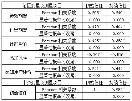 本次研究的调查问卷采用了李克特五级量表。模型共涉及7个变量,其中绩效期望、付出期望借鉴了Davis、 Venkatesh等人的研究设计,社群影响和感知风险参考了Stone& Gronhaug的研究,感知用户评价、初始信任和持续信任的问题设计则参考了赵佳、单初以及陈明亮等的研究。首先进行的预调研共发放问卷76份,预调研后删减多余题项、调整表述细节,形成了最终问卷。 (二)信度与效度检验 为了使问卷能够更加准确地表现理论模型的结构,在进行因子分析前先将变量进行分类,其中绩效期望、付出期望、社群影响、感知风险、感知用户评价作为前因变量,初始信任及持续信任作为中介变量及结果变量。本文选用SPSS 22.0进行问卷内部信度验证,采用了学术界普遍认可的测量标准Cronbach’s Alpha值测量问卷信度,以及 KMO样本测度和Bartlett球体检验问卷效度。具体结果如表1所示。 表1 信度、效度分析结果表 ![]() 问卷中各个变量的Cronbach’s Alpha值均大于0.7,且删除各项后的α值均有不同程度的减小,证明问卷信度水平较好,能够满足后续实证研究的需求。且测得的各部分变量KMO值均达到了0.6以上,Bartlett球体检验的显著性概率小于0.01,说明各变量间显著相关,适合进行因子分析。 表2 旋转后的因子载荷矩阵 ![]() 表2显示,各个项目的因子载荷均大于0.5,且5个因子的题目构成中,绩效期望(PE)、感知用户评价(UE)、付出期望(EE)、社群影响(SI)、感知风险(PR)的题目均聚合在同一个因子下,中介变量初始信任与结果变量持续信任的题目亦各自聚合在同一因子下。综上可知,问卷具备较好的结构效度。 五、假设验证(一)相关性分析本文采用Pearson相关分析法来进行相关性分析。由表3可知,在0.01的显著水平下,有如下结论:绩效期望、付出期望、社群影响、感知用户评价均与初始信任、持续信任显著正相关,付出期望、感知风险与初始信任、持续信任显著负相关,初始信任与持续信任间具有显著正相关关系。 表3 前因、中介变量和结果变量的相关性 ![]() (二)回归分析