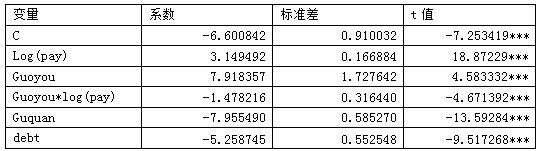 刘馨竹 东北财经大学 摘要:现阶段,随着社会主义市场经济的逐渐发展,上市公司数量的增多,委托——代理问题日渐成为我国资本市场发展亟待解决的问题,而高管薪酬则是委托——代理问题中最为核心与关键的问题。本文运用统计学和数学的理论方法,利用SPSS和Eviews软件,深入研究高管薪酬与公司绩效的关系,深入了解影响公司绩效的因素,包括高管薪酬、股权激励、负债率与股权集中度等,进而促进公司及资本市场的进一步发展。 关键词:高管薪酬;公司绩效 随着经济的发展,委托-受托关系日益成为上市公司管理制度的主流。现代公司治理理论认为,委托人和代理人具有不同的经济利益,及信息不对称的问题,因此,代理成本不可避免。大多数公司高管是风险规避型,而公司股东属于风险中性。如何尽可能地发挥职业经理人的作用,提高公司的绩效成为资本市场亟待解决的问题。近来,有多种研究表明,高管薪酬与公司绩效存在相关关系。本篇论文将进一步研究高管薪酬与公司绩效之间的相关关系。 一、被解释变量 评价公司绩效的指标有很多,包括总资产收益率、净资产收益率、营业收入增长率等等,也可以通过主成分分析法,将这些进行组合。但是本论文中,我们选择总资产收益率(gongsi)这一指标来衡量上市公司的经营绩效。 二、解释变量 (一)高管薪酬(pay) 在这篇论文中,我们认为高管薪酬不仅包括从公司领取的工资、津贴、奖金和福利,同时也包括每年根据持股数量分得的股利。而这里的高管并不考虑上市公司财务报表中披露的全部职工薪酬,而是选择高管前三名薪酬之和的平均数进行估计。 (二)股权激励(guquan) 根据委托——代理理论,公司高管会持有一定数量的公司股票,而高管所持股票的数目也可衡量一个公司对该理论的践行程度。我们采用的是上市公司所有高管所持股票的数目/上市公司总股数这一指标衡量高管所持的股票数目,因为该因素也会对公司绩效产生影响。 (三)公司规模(SIZE) 本论文中用ln(公司总资产)这一指标来衡量公司的规模,该指标数值越大,代表公司的规模越大。 (四)负债率(DEBT)公司总负债/公司总资产 公司的负债情况可以间接地表明公司的经营状况与资产结构,同时会在很大程度上对公司的总资产收益率产生影响。 (五)股权集中度(Z)公司第一大股东/公司总股数 股权集中度高的公司,大股东相当于其他股东而言拥有更多的公司股权,其利益与公司的利益联系的更为密切。因此他们有动力加强对公司经营者的监督,如对高管业绩与薪酬状况的监督,同时监督也是更有效的。 (六)虚拟变量(guoyou)(国企(1)or非国企(0)) 国有企业因受国资委的控制,决策并不由高管完全决定。因此,在进行分析时,要将国有企业与非国有企业分开进行分析。 三、行业选择 选取的上市公司为证监会对上市公司的次级分类下的软件和信息技术服务业。因为软件和信息技术服务业属于高新行业,高管的决策在很大程度上对公司绩效有重大的影响,因此选此行业进行分析。 四、共线性的识别 首先,运用相关系数法计算模型中解释变量的两两相关系数,得到如下结果: 表1 ![]() size变量与guquan变量的相关系数达到-0.51,共线性程度较高,其他例如guquan变量与pay1变量之间的相关系数值也很高,所以模型可能存在共线性问题,运用逐步回归法来减小共线性: 首先用公司绩效gongsi变量对每个解释变量做二元回归: (一)gongsi与ln(pay) (上图中的pay1)变量:R^2=0.472704 (二)gongsi与debt变量:R^2=0.333316 (三)gongsi与guquan变量:R^2=0.063496 (四)gongsi与size变量:R^2=0.019646 (五)gongsi与Z变量:R^2=0.003541 其次按照R^2大小进行排序,逐一加入方程之中发现当size加入方程后,原来变量的显著性发生了改变,所以在后面的分析中我们剔除了size这一变量,以控制后续分析的共线性程度。 五、回归分析 引入模型的解释变量包括:高管薪酬ln(pay),负债率debt, 高管持股比例guquan, 股权集中度z,及虚拟变量(guoyou),被解释变量为公司绩效gongsi 表2 ![]() 仅有log(pay)这一变量显著,其余变量皆不显著;但考虑到其为截面数据,故观察其残差图,发现:可能存在异方差的问题。 ![]() 图1 六、异方差的识别与解决 采用white检验识别异方差: 原假设:模型不存在异方差 备择假设:模型存在异方差 表3 ![]() 因此,在0.06的显著性水平上可以拒绝原假设。因此,方程存在异方差,且得出这一结论的把握为94%。 通过Eviews7的操作,得到加权最小二乘后的结果: 表4 ![]() 在显著性水平为0.05的条件下,最终的回归方程为: Gongsi=-6.6+3.15*LOG(PAY)+7.92*guoyou-1.48GUOYOU*LOG(PAY)-7.96*debt-5.26*guquan (18.87229) (4.583332) (-4.671392) (-13.59284) (-9.517268) R^2= 0.989329 DW=1.730318 表5 ![]() *表示变量在0.1水平下显著,**表示变量在0.05水平下显著,***表示变量在0.01水平下显著 七、对模型的解释 (一)公司绩效与高管薪酬 从回归方程中可以得到公司绩效与高管薪酬成正向相关关系,高管薪酬越高,公司绩效越好。 (二)公司绩效与国有企业变量 由题可得,国有企业虚拟变量既会影响截距,也会影响斜率,但是国有企业的高管薪酬的公司绩效的影响程度小于非国有企业的高管薪酬的公司绩效的影响程度。 (三)公司绩效与负债率 负债率越高,公司绩效越差。可能的原因在于企业的经营出现问题,所以其负债率高,会支付高昂的利息费用等,影响公司的效率,进而会影响公司绩效。 (四)公司绩效与股权集