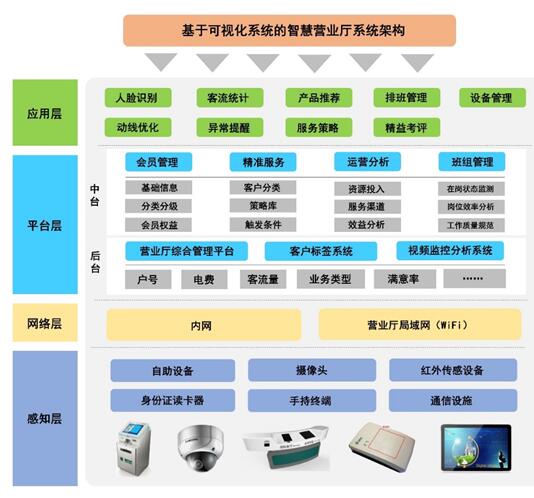 基于可视化系统构建的智慧营业厅是指在传统供电营业厅基础上,融合智能硬件、局域物联、数据分析并通过统一的可视化系统实现数字化、智能化、市场化运营的新型营业厅。其中,可视化系统是是利用信息化、智能化技术,将定性的管理事项转化为数据指标,并通过可视化的应用界面直观明了地为营销人员和管理人员提供运营策略,从而实现高效管理和精准服务的目标。 (一)系统架构 根据泛在电力物联网建设方案,结合电信行业、银行业等电信行业的先行经验,智慧供电营业厅由感知层、网络层、平台层及应用层4部分组成(参见图)。 ![]() 图 智慧营业厅系统架构示意图 1.感知层 主要包括摄像头、自助设备、红外传感设备、身边证读卡器、综合导览设备、移动手持终端等。主要用于数智慧营业厅感知层主要针对单个客户的微观信息、整体客群的宏观信息以及设备、人员工作状况进行数据的采集、数据转化、数据统计等信息输入,具体包括客户的人脸信息、身份信息、动作行为、客流量、业务数量、办理时长、设备使用频次等,为营业厅智慧化运营提供大数据基础。 2.网络层 智慧营业厅网络主要采用内部网进行高效内部管理,同时基于营业厅内的公共WiFi和4G网络采集客户线上行为数据,结合“最多跑一次”的要求,强化与政府事业单位的网络联通。网络层建设对应服务器和网络接口等,需要保证网络信息的安全。 3.平台层 平台层主要包括中台和后台,后台建设基于供电营业厅原有的综合管理平台、客户标签系统,增加视频监控系统,通过信息化平台将摄像头采集到的图像转为化营业厅服务和管理所需要的数据指标,并进行可视化呈现。中台建设根据实际需求开发相应的组合模块,将后台采集到的数据进行关联整合,按照业务需求的属性提取相应的数据,形成组合式的数据管理便于实时调用。中台建设内容包括会员管理、精准服务、运营分析、班组管理等,各模块设计相应的数据分析模型,基于智能化算法,快速生成所需要的结果。 4.应用层 应用层重点结合营业厅的业务场景,制订相应的服务策略和管理措施。主要包括人脸识别、客流趋势预测、产品推荐、排班管理、动线优化、异常提醒等。基于系统的可视化界面,快速匹配相应场景下的应对策略。应用层建设的重要内容包括,应用场景梳理,可视化分析界面设计以及应对策略制订。借助APP、移动作业终端、大屏幕、互动设施等强化营业厅客户的感知和体验,同时更加高效、规范地开展营业厅内部管理。 (二)运营模式 营业厅基于可视化系统构建采集、分析、决策的“智慧三化”运营模式,“智慧三化”是指自动化采集、精准化分析和数字化决策,通过采集、传输和分析用户信息、业务数据、设备数据及区域数据,为营销人员提供各类决策辅助,逐步推动营业厅智慧转型。 1.自动化采集 利用人脸识别技术实现客户身份自动识别,通过视频监控设备实时采集客户、员工身份信息,采集到的信息在系统后台自动生成相应的电子文档,供可视化系统实时调用、实时处理,可视化系统将采集到的数据进行结构化处理,把数据信息转化为视觉化的图表信息,向营销人员呈现营业厅动态运行情况。 2.精准化分析 视频监控采集得到的数据具有较高的真实性和客观性,将视频监控数据与营业厅客户标签库信息、综合服务平台数据、95598数据进行关联匹配,并与所在地区的政府、企业等组织展开数据共享,形成多元化、结构化的数据分析体系,通过对营业厅人流量、客群结构、区域热度等数据的量化分析,为数字化决策提供科学依据。 3.数字化决策 替代人工的经验判断,可视化系统提供了图表化的分析界面,对关键问题设置预警阈值,问题出现时触发预警条件,系统自动发送预警信息,营销人员可及时发现客户服务、产品销售、设备运维、业务承载等方面的问题,并根据科学的数据分析提供改进策略,高效支撑运营决策。 (三)应用场景 1.差异化客户服务 基于可视化系统的身份识别与信息推送功能,提供个性化、差异化、本地化的服务流程。根据历史业务记录,将客户划分为重要客户和特殊客户两类,匹配客户人脸信息和客户标签,客户进入营业厅时,视频监控设备自动进行人脸识别,匹配客户标签,将服务策略推送至营销人员设备终端,营销人员据此提前准备好服务策略,例如,可视化系统识别出VIP客户身份后,营销人员主动上前将其引导至VIP服务区,如已有业务预约,直接呼叫客户经理展开一对一服务。 表1 营业厅客户服务标签分类 ![]() 2.无证业务办理 基于可视化系统的身份识别、信息采集功能和第三方数据接入,简化业务办理中的证件核对环节,实现无证办理。对于新客户,客户需要出示有效证件核对人证是否合一,此时可视化系统将自动进行证件信息的采集与人脸匹配,在可视化系统中建立相应的证件信息库,客户下一次到营业厅办理业务时,只需利用可视化系统验证用户身份,通过安全验证后,即可授权在数据库中调取对应的证件材料信息,不再需要提供实体证件。 3.产品投放优化 基于可视化系统的客流统计、热力图监测功能,统计分析进出营业厅客户的年龄、性别等分布信息,生成营业厅客群基础画像。根据客群画像投放合适的产品和服务。投放后利用热力图监测分析来确定客户实际的产品偏好,缩减冷门产品的投放