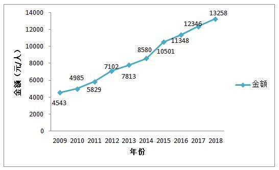 图2 2009~2018年东营市农村居民平均可支配收入折线图