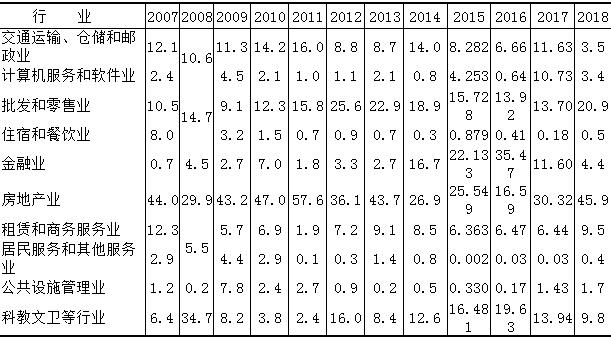 表3 2007~2018年山东省服务业各行业实际利用外资占服务业利用FDI的比重 (%)