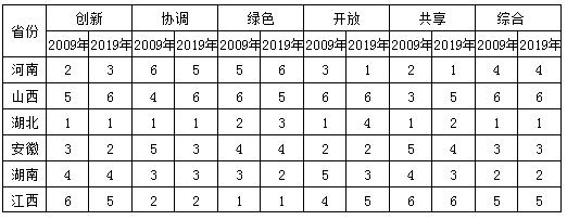![]() 图1 2019年中部六省高质量发展水平得分 由图1,2019年中部六省综合发展水平得分区间为0.2042-0.7524。根据综合得分,可将六个省份划分为明星型(得分大于0.7)、平庸型(得分介于0.5和0.7之间)和落后型(得分低于0.5)3种类型。明星型省份的综合发展水平得分高于0.7,仅湖北一个省份。湖北在经济发展过程中不仅能够重视经济发展规模的提升,还能重视提升经济发展质量,综合表现优秀。平庸型省份综合得分为0.5-0.7,包括湖南、安徽、河南。这些省份综合发展水平略显平庸,具有一定的改进空间。落后型省份的综合得分低于0.5,包括江西和山西。这些省份对经济发展质量的重视程度严重不足,具有较大的提升空间。 (二)中部六省高质量发展的时间演变 为了对比中部六省发展水平的时间演变情况,对2009年各省的经济社会发展水平进行测度,并和2019年各省在各子系统和综合得分上的排序进行对比(见表3)。可以发现,近十年中部六省的综合发展水平排名不变,但是在不同子系统当中发展水平排名有所变化。 表3 2009年和2019年不同子系统下中部六省高质量发展水平排序 ![]() 四、基于新发展理念的中部六省高质量发展的推进路径 (一)增强创新的引领作用,培育中部发展新动能 根据实证分析结果,中部部分地区如山西、江西、湖南三省创新能力较弱,创新驱动水平的地区差异较大,其对经济发展的动力源作用还未完全显现。因此,要增强创新对经济发展的引领作用,培育发展新动能。一是完善创新保障体系。完善企业自主创新鼓励机制和知识产权的保护制度;加大对于创新创业的投资者,给予项目补助和投资风险补助力度;建立针对科技贷款和科技投资的风险补偿机制;为创新企业提供贷款优惠,破解创新企业的融资难问题,促进良好创新环境的形成,使创新资源不断向企业集聚。二是加强创新人才队伍建设。要充分利用高校和科研院所密集的优势,培养研究型人才;发挥中等职业院校、技校和成人院校的作用,培养技能型人才;搭建高端人才交流发展平台,完善人才配套服务政策,建立人才服务绿色通道,为人才在签证落户、子女入学、医疗保障等方面提供全方位的便捷高效服务。三是搭建科技成果转化平台。充分利用各大自主创新示范区的优势,搭建科研成果转化平台。通过市场化手段进行资本和技术的整合,建设一批企业技术中心、工程中心、工程实验室,多个工业技术联盟,形成产学研一体化机制,促进创新成果转化和科技研发水平的提高。 (二)加强区域统筹,促进中部地区协调发展 由表2、图1可知,目前中部地区的发展不平衡现象较为严重,部分领域领先省份与落后省份的差距很大。中部各省在认准自身优势的同时,应当根据自身省情制定相应的政策,补短板强弱项,推动自省经济社会高质、高效、协调发展。例如,引导资源枯竭地区、生态严重退化地区如山西积极探索特色转型发展之路。河南应重点着眼于绿色发展,依托科技创新减少发展中带来的环境污染,加大环境治理投入,提高环境治理成效。江西应更加注重经济发展的有效回馈社会性,提高民生福利水平,使发展的成果由全体人民共享。通过补短板强弱项,实现中部经济社会的协调发展。 (三)重视绿色发展,建设美丽中部 中部地区拥有洞庭湖、鄱阳湖等众多湖泊,且位于长江、黄河、淮河流域的中上游地区,是南水北调中线工程的水源地。因此,加强中部地区的生态环境建设和保护力度,对于保障流域沿线的生态安全和人居环境安全至关重要。但同时,中部地区大部分地区仍处于工业化中期,经济发展任务艰巨,存在传统经济发展理念与生态文明发展理念的冲突和对立。高速度发展阶段把对环境的整治和保护支出作为成本因素考虑,而高质量增长阶段把环境当成发展追求的目标,是社会财富的重要组成部分。在高质量发展阶段,必须重视生态环境保护,把生态环境内化为经济发展的动力。一方面,要增强资源生态环境的整治和修复力度,设置资源节约标准,敦促企业重视资源的可延续性。另一方面,提高企业的污染准入标准,严惩违规排放企业。加快构建生态文明体系,建设绿色发展的美丽中部。 (四)坚持对外开放,释放中部发展潜力 中部地区要加强开放的范围和力度,使各项要素和产品既“引得进来”,又“走得出去”,做到两者的有机结合。一方面,不仅积极引进外国资本、技术和商品,弥补本地在技术落后、资金不足和产业结构方面的缺陷,更要实现观念和政策的开放。另一方面,找准在全球化分工中的准确定位,提高对区位优势和资源禀赋等利用效率,扬长补短,形成有利要素,积极与周边国家和地区加强合作,以活跃的进出口业推动民族地区的综合发展。[2]以 “一带一路” 建设为契机,推动民族地区与沿线各国的良性互动,发掘区域内市场潜力,促进投资和消费,创造需求和就业。例如,对外开放水平上,山西近十年一直处于中部六省的末位(见表3)。但是山西的制造业、煤化工、特色农产品等产业,与东盟国家的产业发展互补。山西应探索与东盟的贸易对接,深度融入一带一路建设,提升对外开放水平,进一步释放发展潜力。 (五)共享发展成果,共创中部美好未来 共享是高质量发展的根本目的。在中部崛起战略中应坚持以人民为中心,切实改善和保障民生,进一步加大在教育、就业、社会保障、医疗和公共卫生、环境保